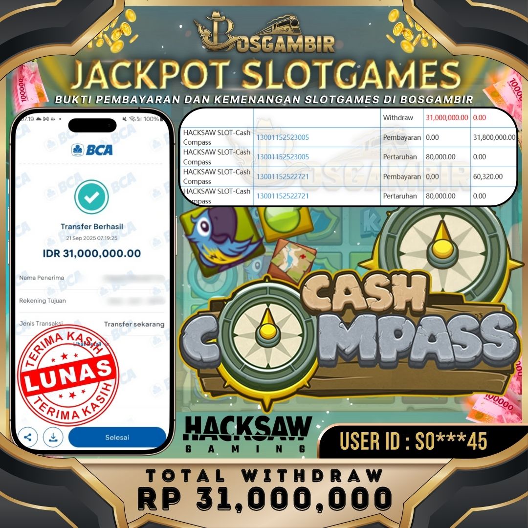 Bukti Pembayaran Jackpot Slot Game HACKSAW SLOT-Cash Compass Rp 31,000,000