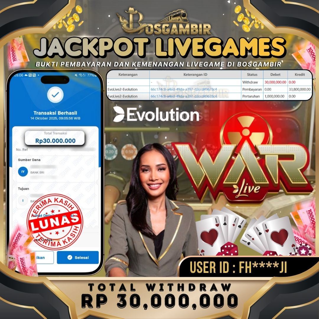 Selamat untuk User ID:FH****JI yang berhasil mengantongi kemenangan fantastis Rp30.000.000 dari LiveGame EvoLive2 – Evolution di Bosgambir! Berkat langkah berani dan strategi jitu, ia sukses membawa pulang cuan besar. Di Bosgambir, setiap kemenangan selalu dibayarkan penuh tanpa potongan sebagai bukti nyata komitmen kami pada permainan yang adil, aman, dan transparan. Sekarang giliranmu untuk membuktikan kemampuan dan menjadi jawara berikutnya! Sekarang giliran kamu untuk membuktikannya—raih jackpotmu hanya di https://www.bosgambir.org