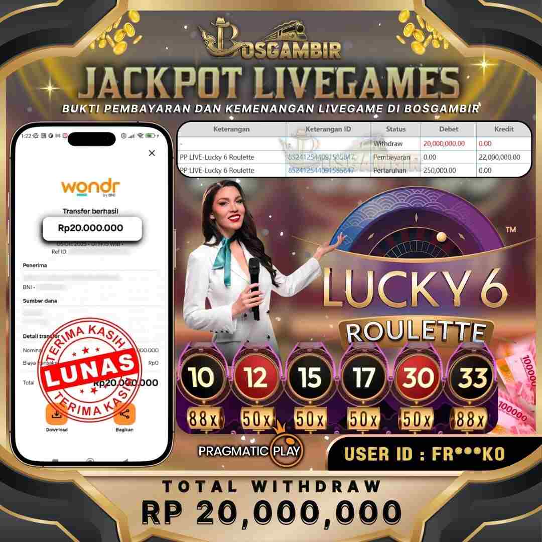 Bukti Pembayaran Jackpot Live Game PP–Live Lucky 6 Roulette Rp 20,000,000