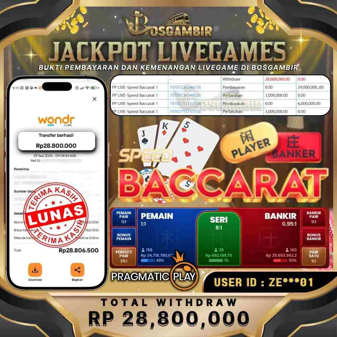 Selamat kepada User ID: ZE***01 yang sukses meraih kemenangan fantastis Rp28.800.000 dari Live Game PP LIVE – Speed Baccarat 1 di Bosgambir. Dengan strategi tepat dan keberanian bermain, ia membuktikan setiap putaran bisa jadi jalan menuju cuan nyata. Bosgambir selalu membayar kemenangan penuh tanpa potongan, proses cepat, aman, dan transparan sehingga member bisa bermain dengan nyaman. Bukan hanya sekadar hiburan, setiap permainan di Bosgambir memberi peluang besar untuk jackpot nyata, dan kini saatnya kamu sendiri yang membuktikan sensasinya di link resmi https://www.bosgambir.org