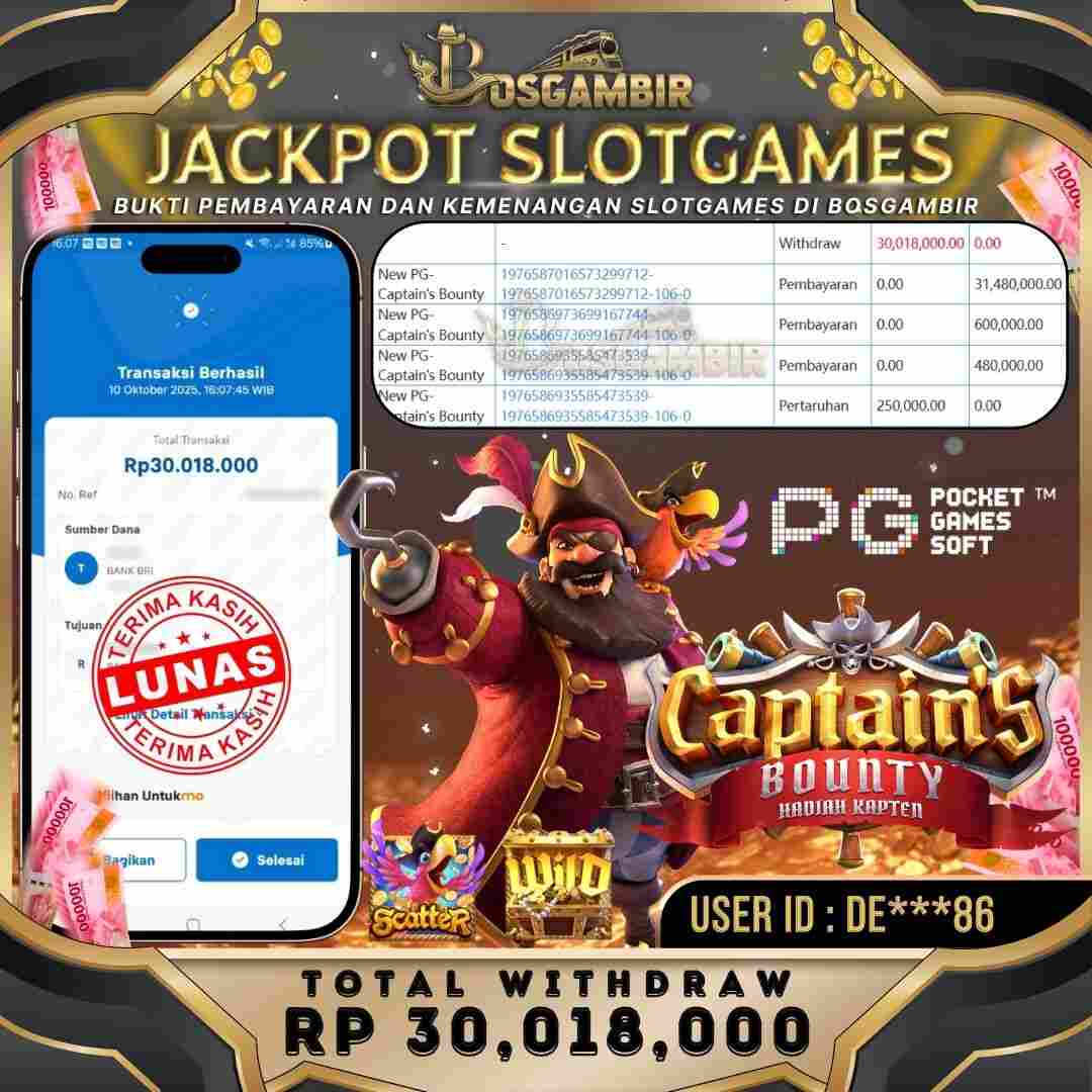 Bukti Pembayaran Jackpot Slot Game New PG-Captain's Bounty Rp 30,018,000